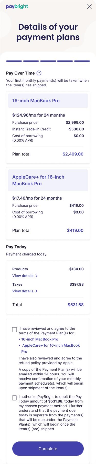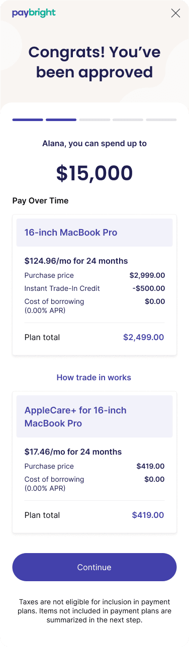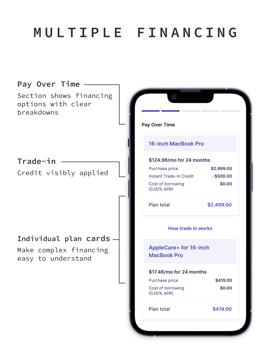 In early 2021, PayBright was selected as Apple’s first financing partner in Canada. Their requirements pushed far beyond traditional BNPL. Some items were financeable, some weren’t, taxes always had to be paid upfront, and trade-in credits had to flow cleanly into the same checkout. All of this needed to launch for Apple’s September product release, giving us an eight month deadline.