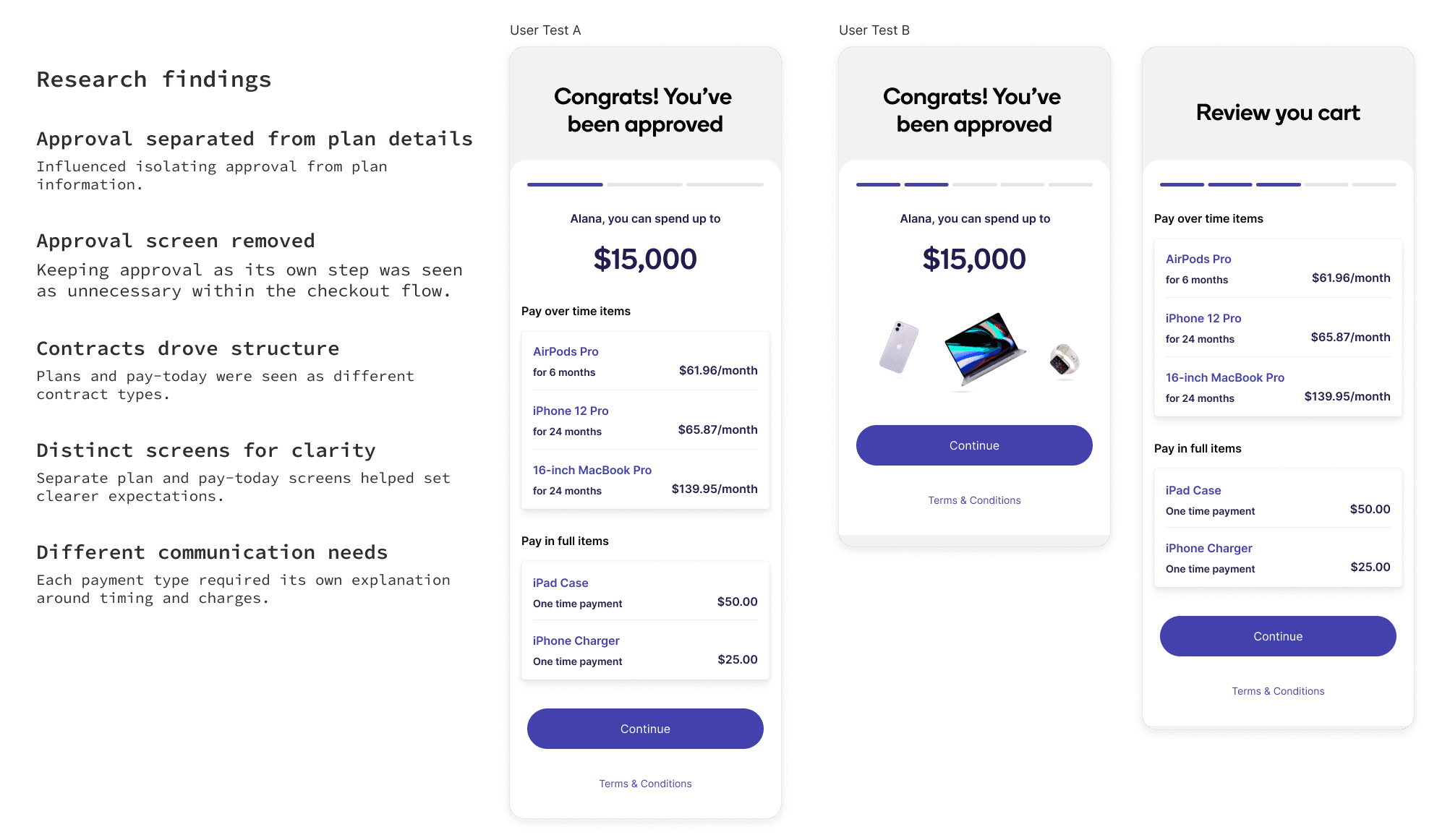 We ran interviews and observational tests with people familiar and unfamiliar with BNPL. The biggest takeaway was that people struggled most when the complexity was hidden.